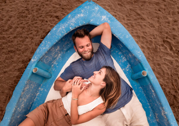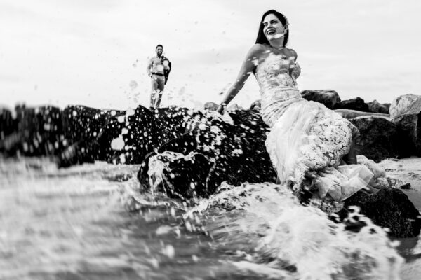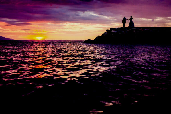 bride and groom are walking on the beach, the bride is looking to the camera and on the back ground there is a warm light