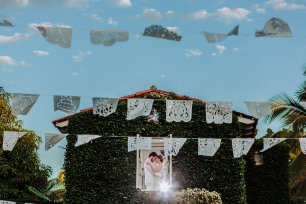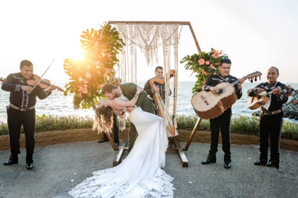 bride are in foreground and smiling with her bouquet, on the background the groom is dress as a Mexican charro and smiling