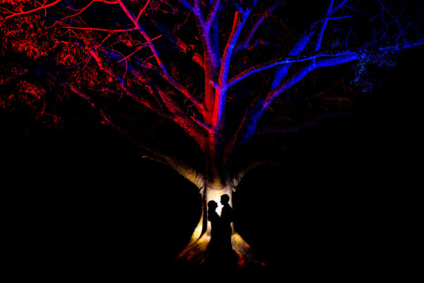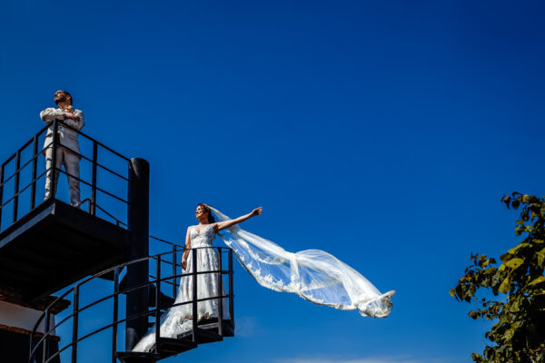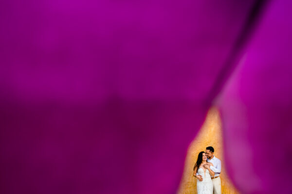 couple is hug each other during sunset time, they are on a siluette and the veil have light on it from the sun