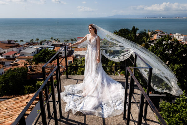a bride in a white beautiful dress with a bouquet in her hands is on a balcony with the ocean by her side, the glass of the balcony is reflected the bride too