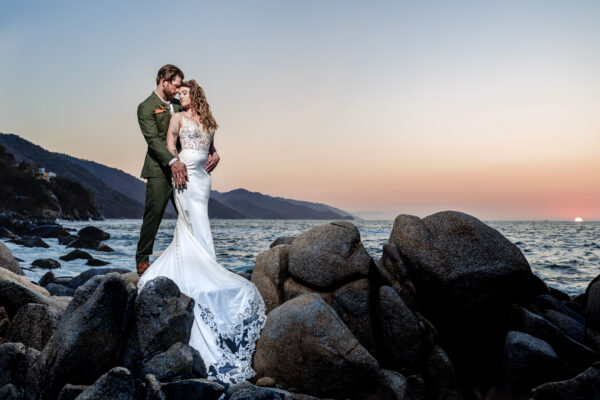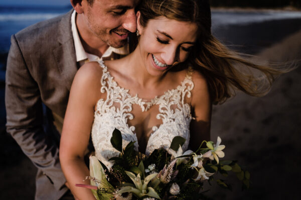 groom is hugging the bride from the back, she il holding the bouquet with both hands, both are on the beach with Puerto vallarta in the background