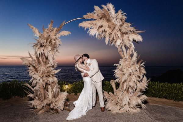 couple walking and smiling at the end of their wedding ceremony with the ocean o nthe background