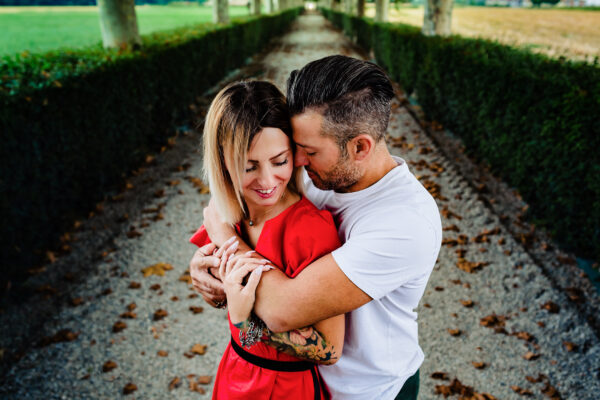 bride and groom ar hugging each other in a sweet moment, there is a little bit of out of focus in front of the camera