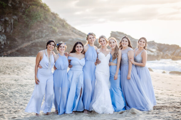 bridemades are hugging the bride on the beach, they are holding flowers and they have the ocean on the background