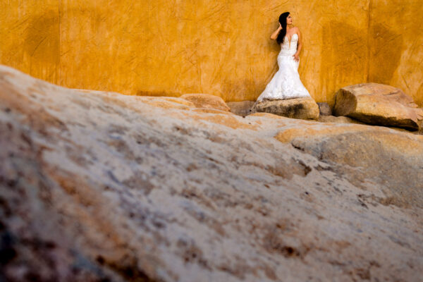 bride and groom are looking at each other and relaxing on a black wall, the groom is dress as a Mexican charro with a big heat
